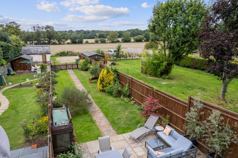 Rear Garden. Westerly facing and mainly laid to lawn with a large patio area, selection of established shrubs and trees, centre pathway leading to gravelled parking area and a Detached Double Garage. Attractive aspect over open fields.