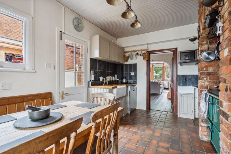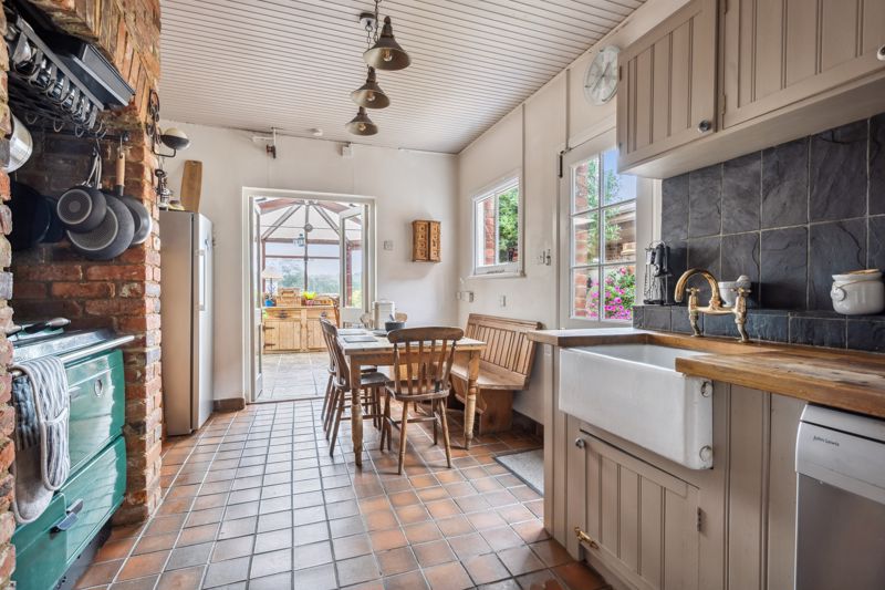 The Kitchen / Breakfast Room has a range of units with wooden worktops, inset Butlers style sink, space and plumbing for dishwasher, recessed area suitable for Aga/space for breakfast table and side door access. Tiled flooring and splashbacks, space for fridge/freezer. Double doors lead to a Conservatory with access and aspect over the Rear Garden