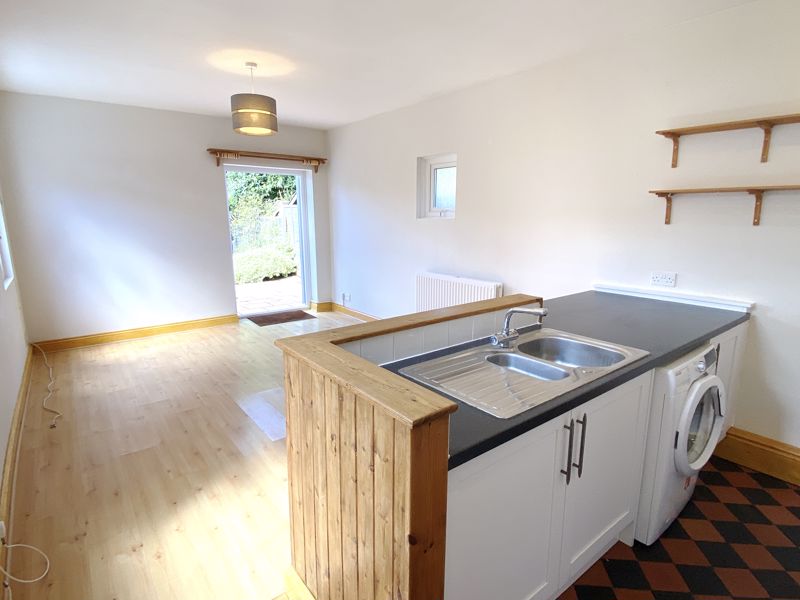 Sitting Room / Kitchen Area with wood effect flooring and double doors leading to Garden. Kitchen area comprises of a range of wall and base units with inset sink, built in oven and gas hob with overhead extractor, integrated fridge/freezer and tiled splash backs.
