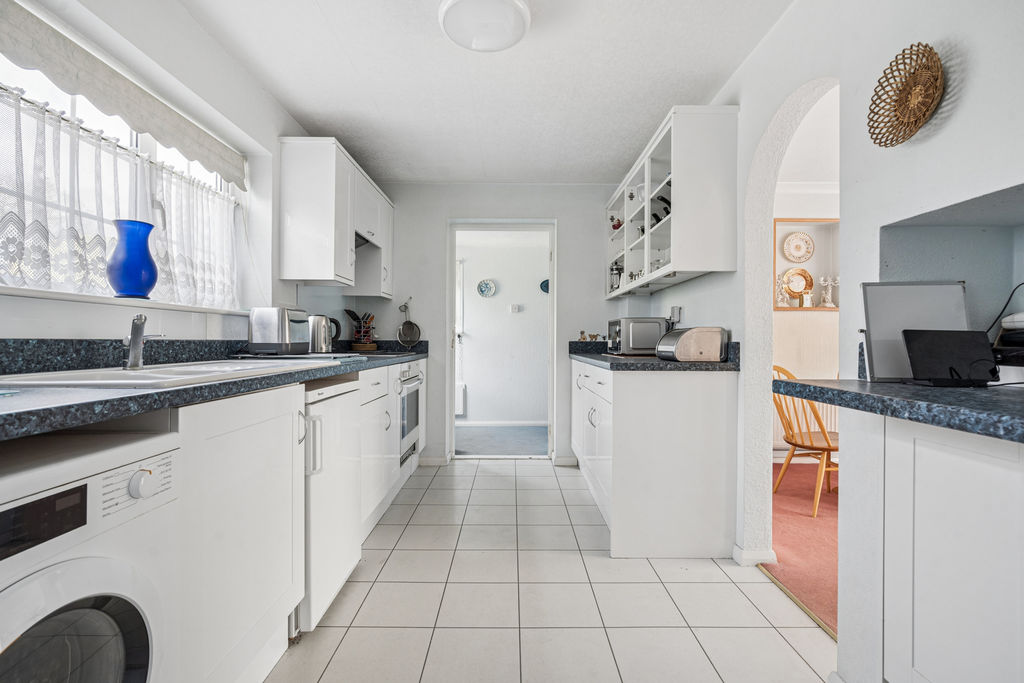 Kitchen, fitted with a range of built in wall and base units providing ample worktop surfaces, integrated oven, hob and overhead extractor, space and plumbing for washing machine and under counter fridge. Tiled flooring and window. Leading to Rear Hallway/Utility Area with door to Front Garden and door to Rear Garden.