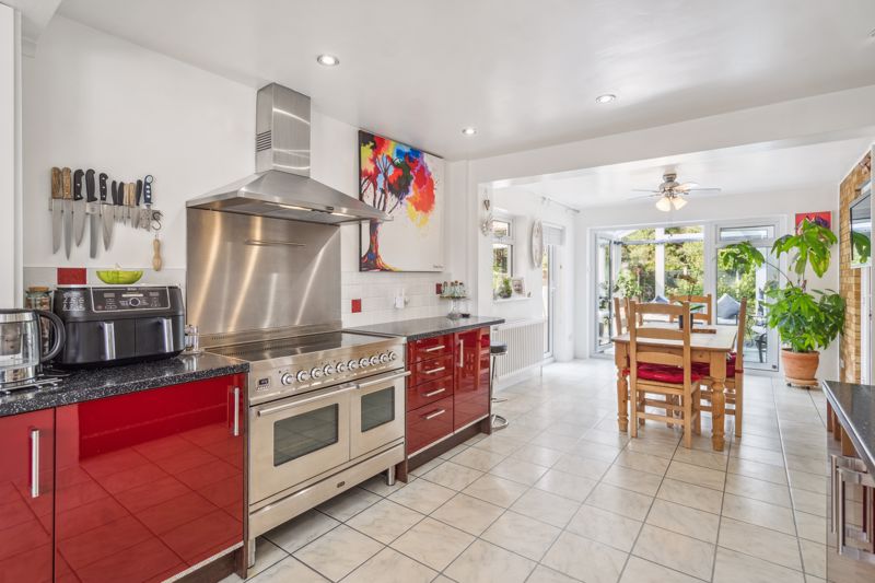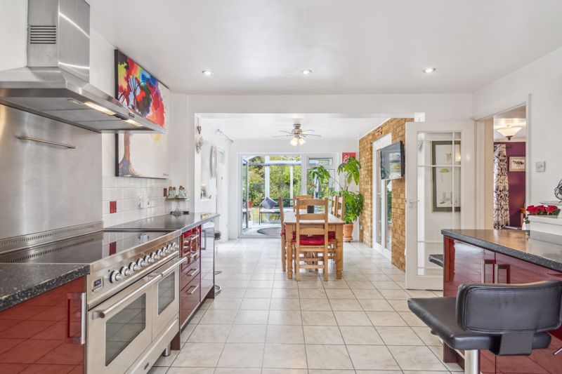 Large Kitchen/Dining Room, fitted with a comprehensive range of wall and base units with ample worktop surfaces, space for large Range style cooker, various integrated appliances and tiled flooring throughout. Double doors leading to a Conservatory with triple aspect over the Garden, tiled flooring and double doors giving access to the Garden.