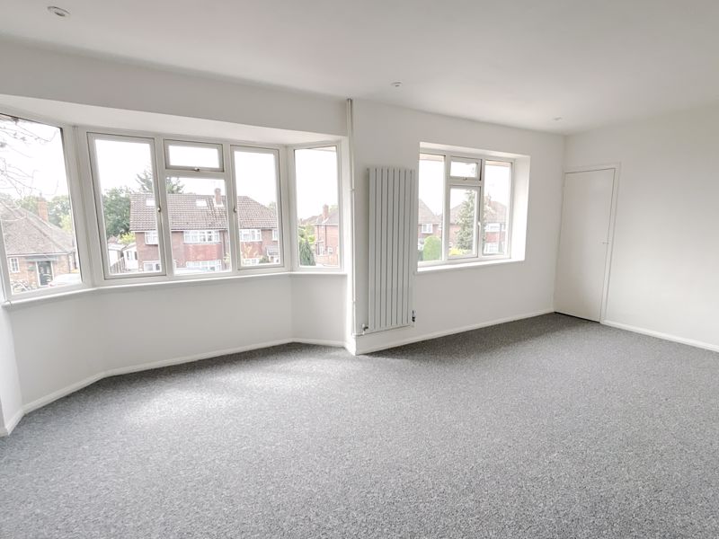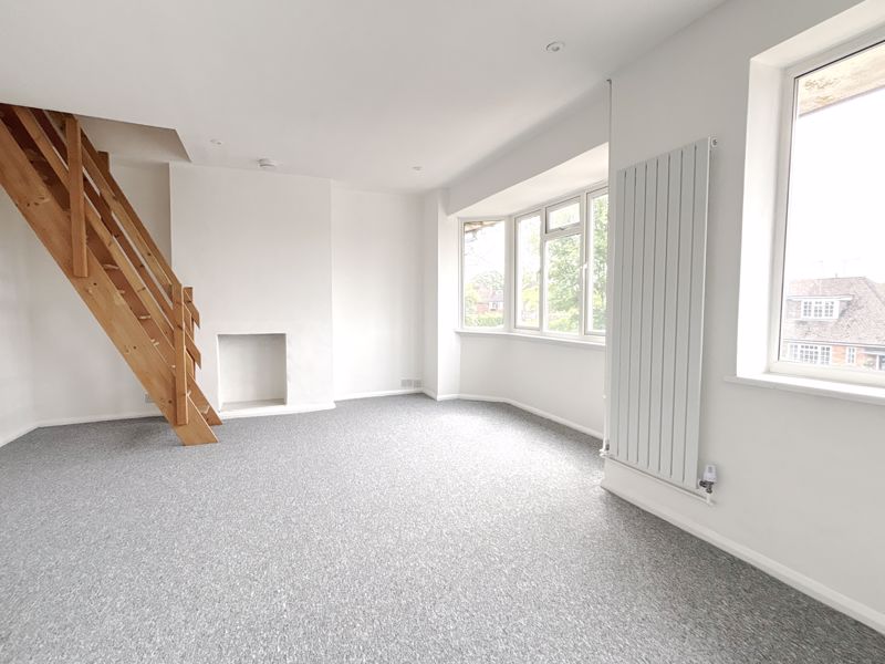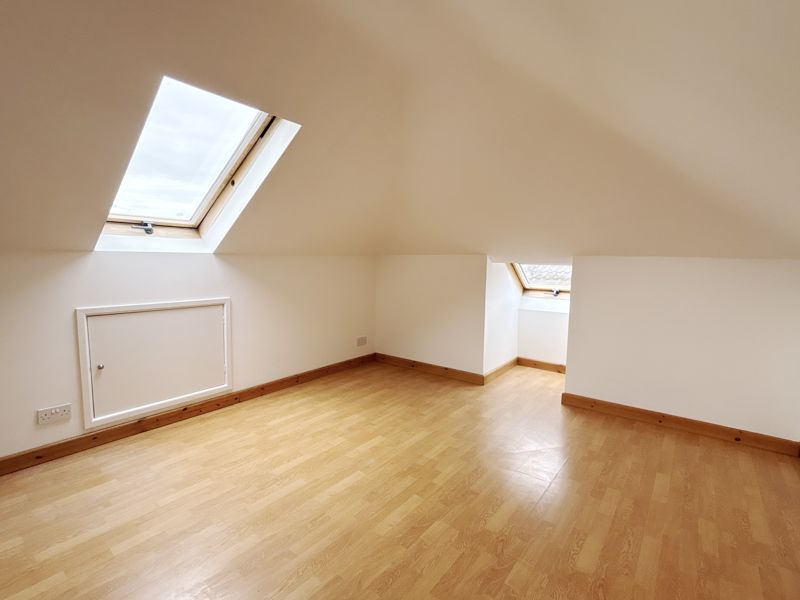 Large Sitting Room with bay window and southerly aspect and storage cupboard. Staircase leading to Bedroom Two with velux windows, wood effect flooring and eaves storage