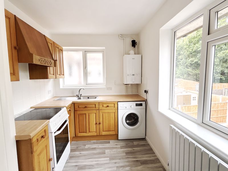 Kitchen fitted with a range of wall and base units with worktop surfaces, space for cooker with overhead extractor, space and plumbing for washing machine, space for fridge freezer, wall mounted gas boiler, aspect to rear.