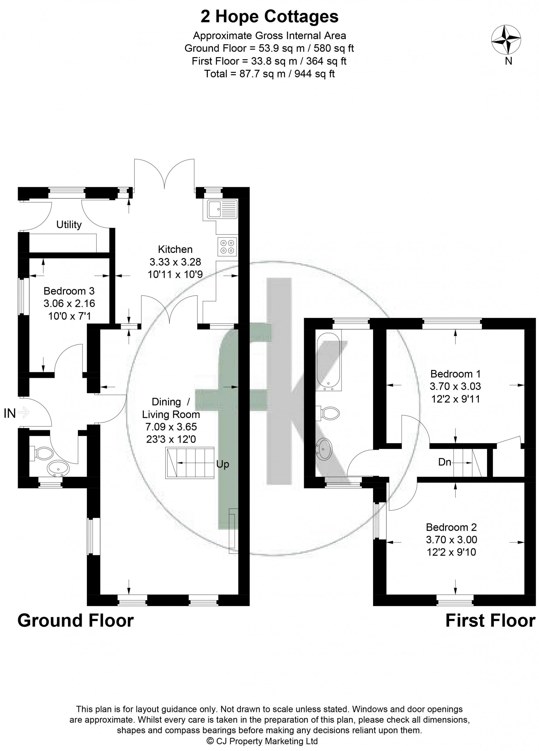 Entrance Door into lobby area with access to downstairs Bedroom 3 / Study and the Cloakroom. Opening into Dining / Living Room with a central staircase and glazed double doors into the Kitchen/Breakfast Room with French Doors opening onto the rear terrace. Utility Room has space and plumbing for Washing Machine, Tumble Dryer and Dishwasher and side door access. Upstairs there are two double bedrooms and a bathroom suite with overhead shower to the bath.
