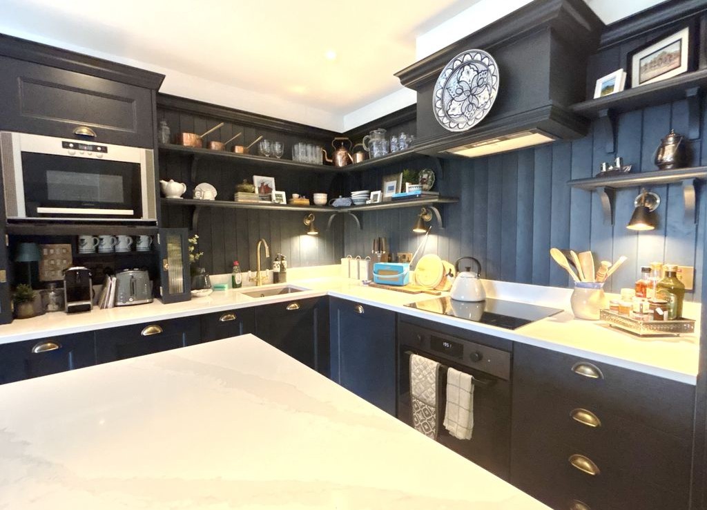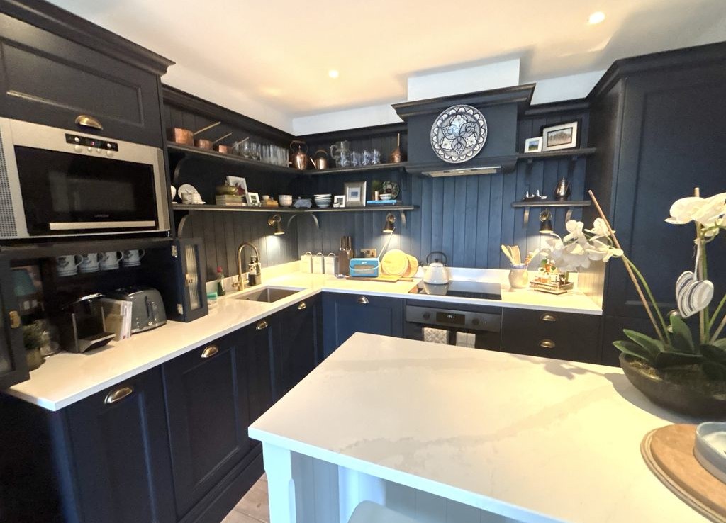 Open Plan Kitchen fitted with a good range of quality wall and base units and a centre island/breakfast bar area, integrated hob and oven with overhead extractor, integrated fridge/freezer and half sized dishwasher, space and plumbing for washing machine.