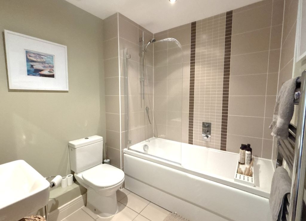 Bathroom comprising of a paneled bath with overbath shower and screen, WC, wash hand basin, tiled flooring and walls.