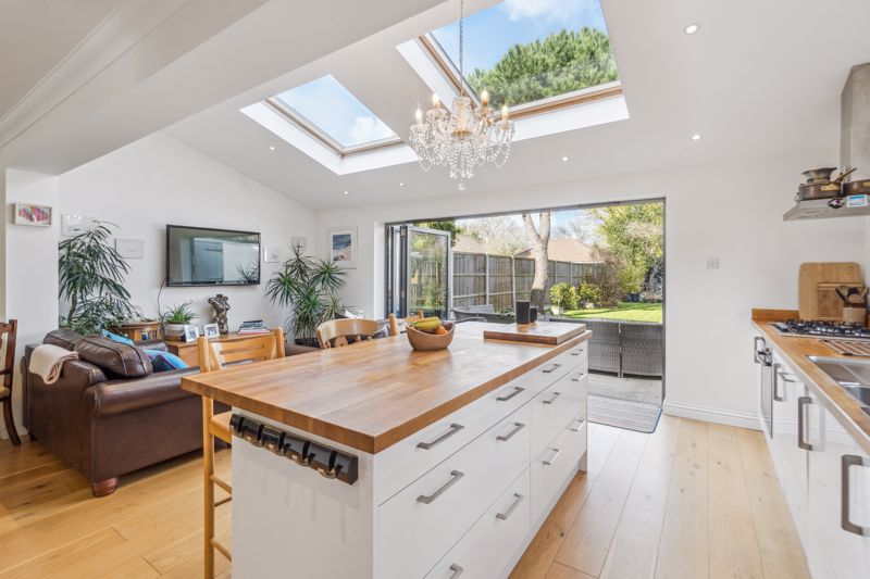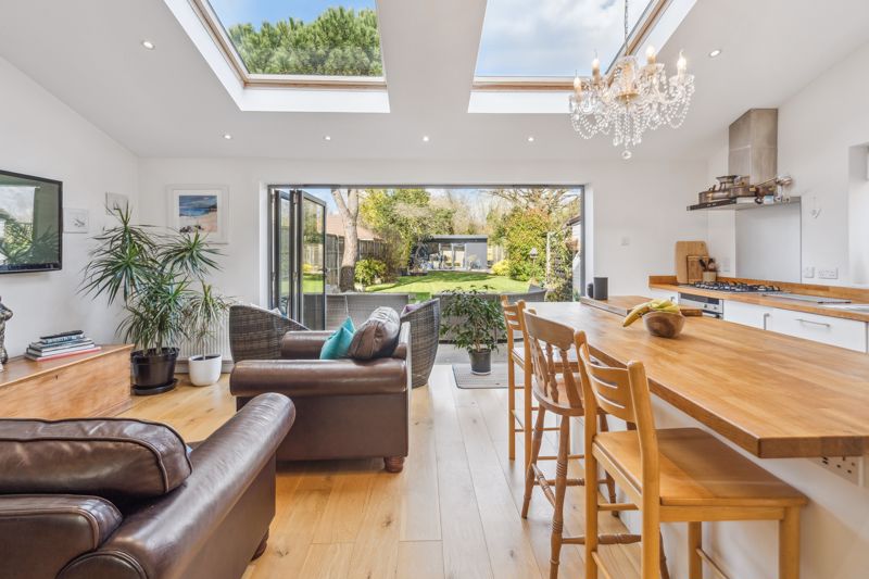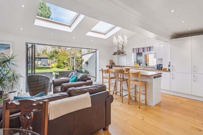 Kitchen / Family Room with a vaulted ceiling with Velux windows, fitted with a range of wall and base units including a centre island unit. Integrated oven and five ring hob with overhead extractor, sink with mixer taps and drainer, integrated dishwasher and fridge/freezer. Wooden flooring and bi folding glazed doors giving access to the Garden.
