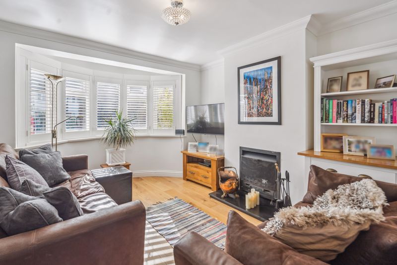 Spacious through Living Room with semi circular bay window, wooden flooring, open fireplace, leading to: