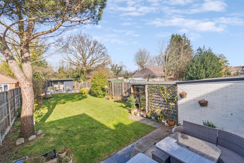 Rear Garden, mainly laid to lawn with a patio area and a selection of established trees,potting shed and wood store.  Large Garden Room/Studio with bi folding doors, power and light. Garage with up and over door, power and light, rear Garden Store.